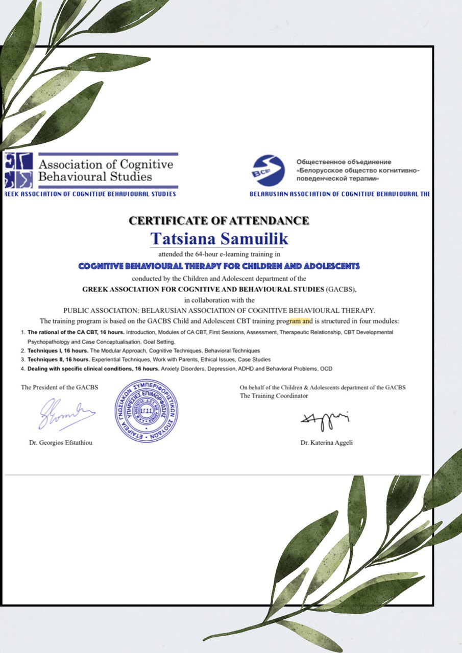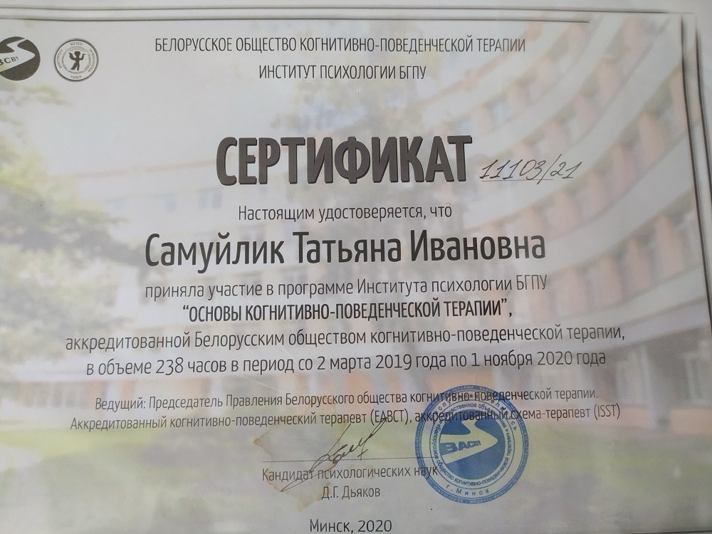 2019-20 гг. - «Основы Когнитивно-поведенческой терапии» Белорусского сообщества КПТ, Институт психологии БГПУ