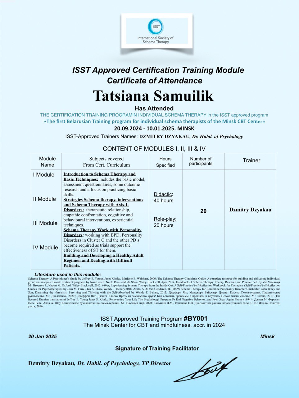 2024-25 гг. - «Индивидуальная схема-терапия» ISST Approved Certification Training
