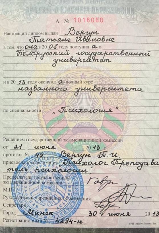 В 2013 окончила Белорусский Государственный университет, по специальности «психология». После получения диплома достаточно долго работала государственным судебным экспертом-психологом (работала на базе РНПЦ Психического здоровья), а так же проводила психофизиологические исследования с использованием полиграфа. Опрашивала детей и взрослых, пострадавших от насилия, представляла их позицию в суде. Видела много поломанных судеб и страдающих от психических и психологических проблем людей. Приняла решение уйти из экспертизы в психотерапию.