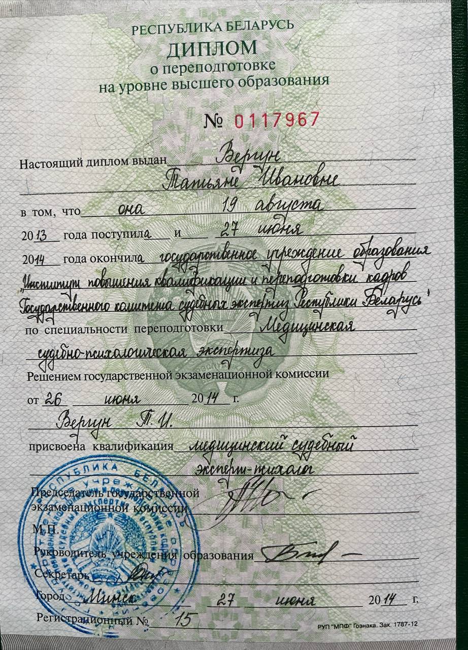2013-14 гг. - Переподготовка в Институте повышения квалификации ГКСЭ РБ «ГМСЭ-психолог», стажировка на базе психиатрического стационара с углубленным изучением психодиагностики, юридической и клинической психологии
