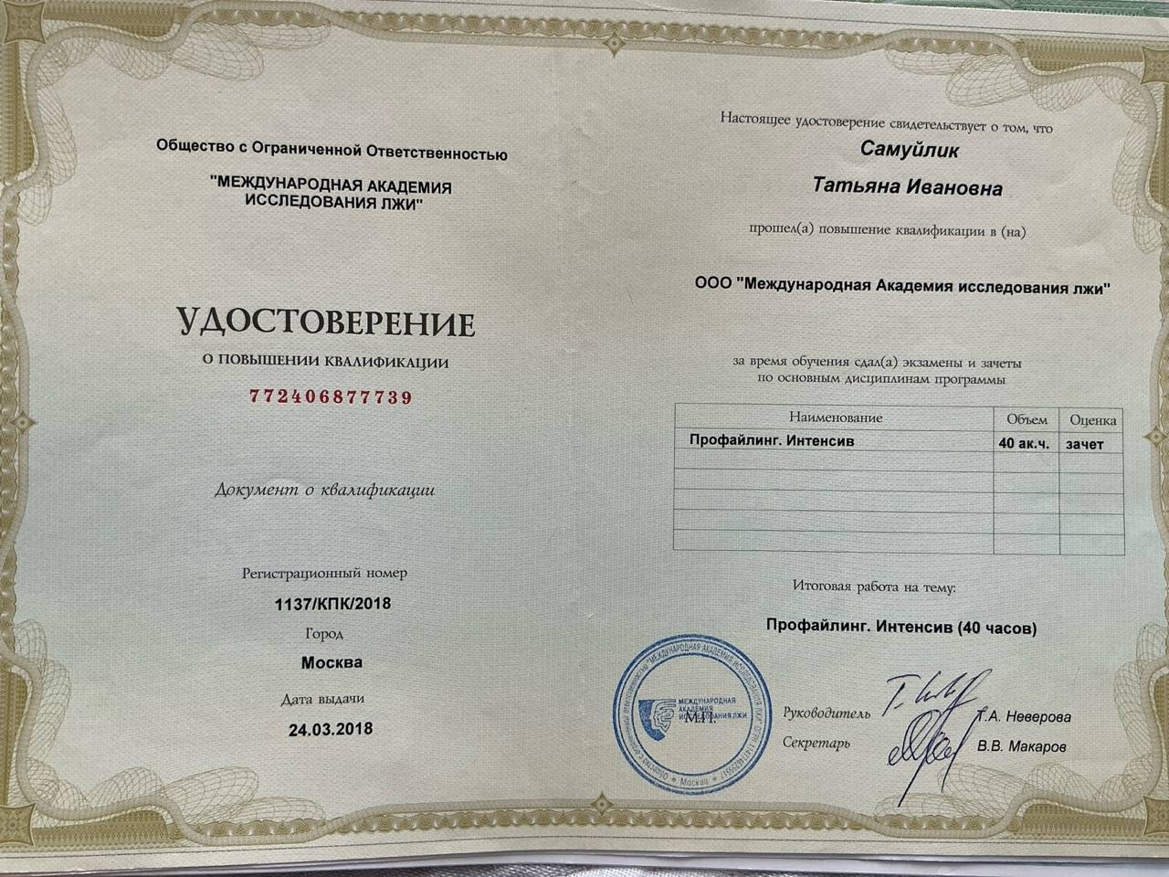 2018 г. - Профайлинг интенсив «Международная академия исследования лжи» г. Москва